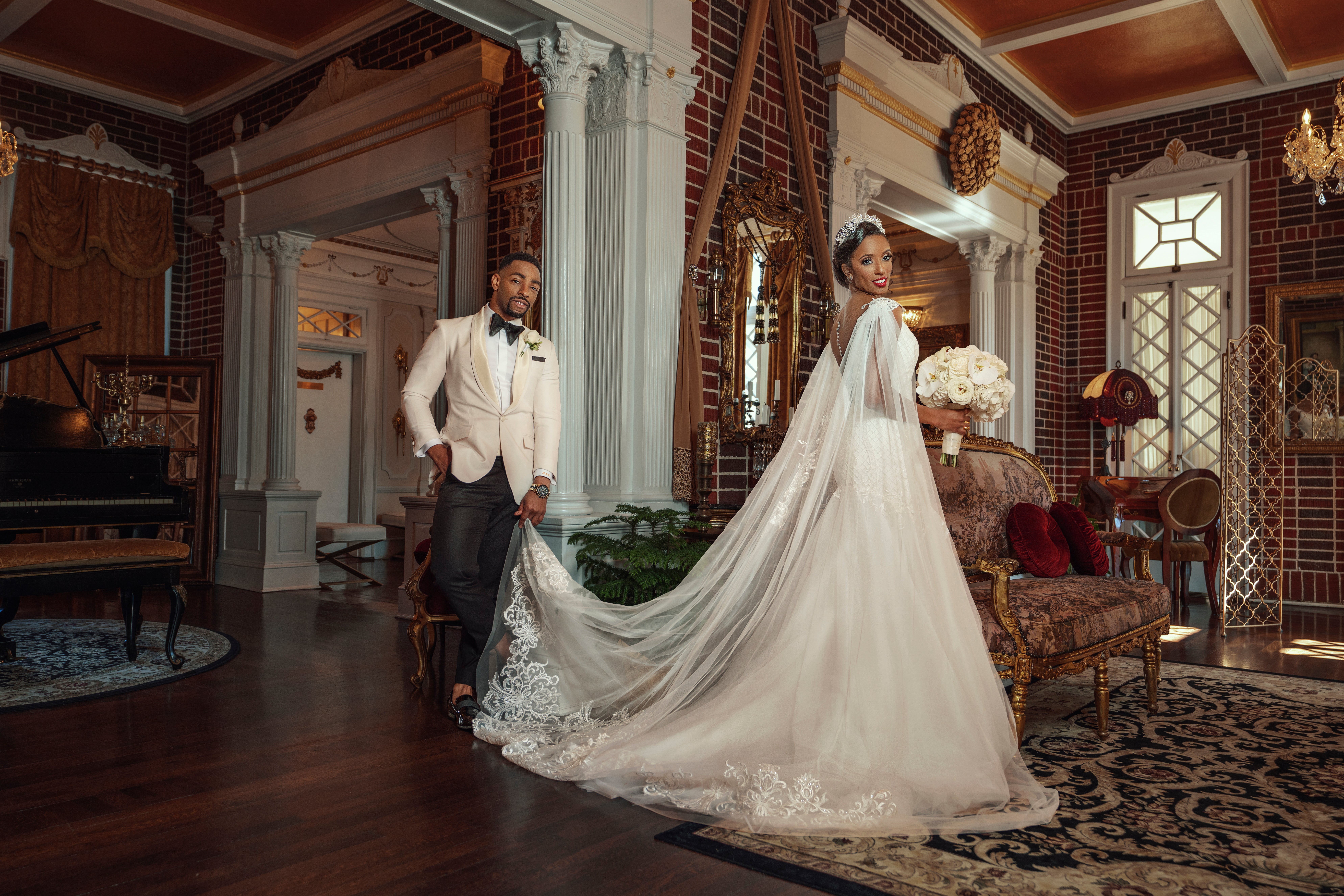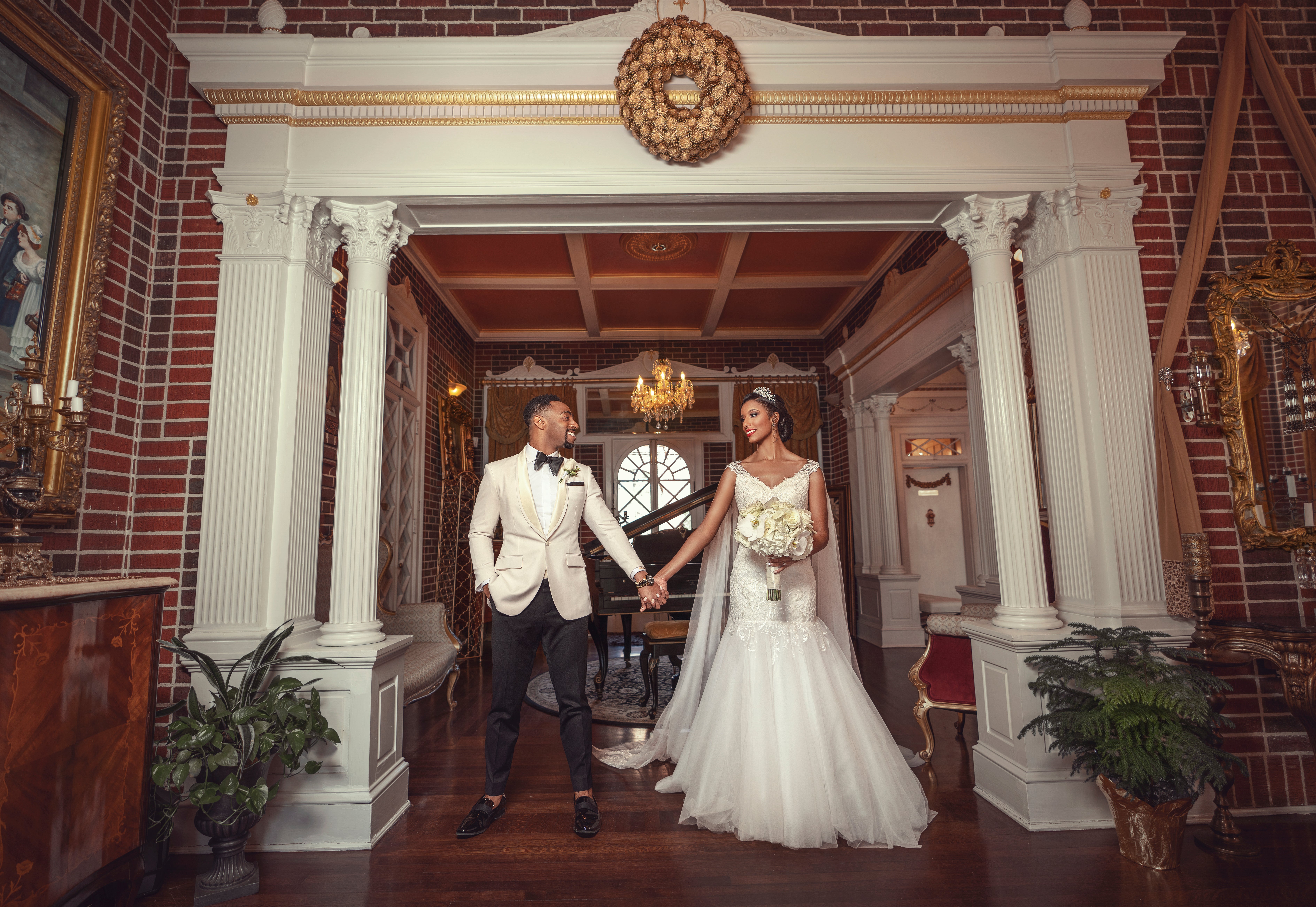 Fast forward to March 2019, the couple said “I Do” in a wedding ceremony that had just as much pizzaz and character as their proposal. The wedding took place at the Historic Mankin Mansion in Richmond Virginia, and was peppered with plenty of red carpet glam. The black and white color scheme was accented with hints of glamorous golds and romantic reds. Wedding planner Waverly Coleman helped the Bascombes achieve their desired aesthetic while keeping them on budget. Mission accomplished!