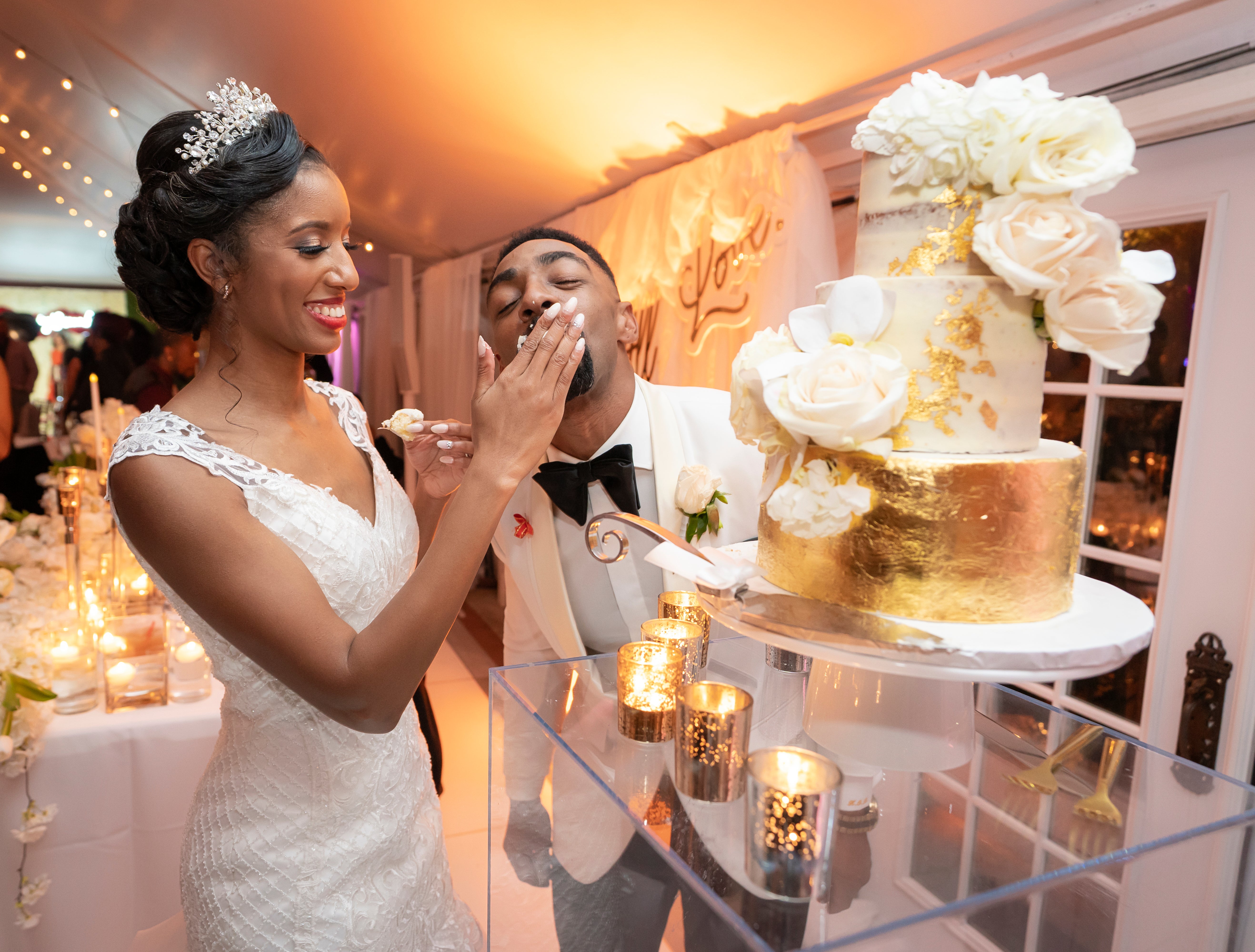 The couple incorporated tons of gold elements into their wedding, from the invitations all the way to their wedding cake. Shine on, y’all!