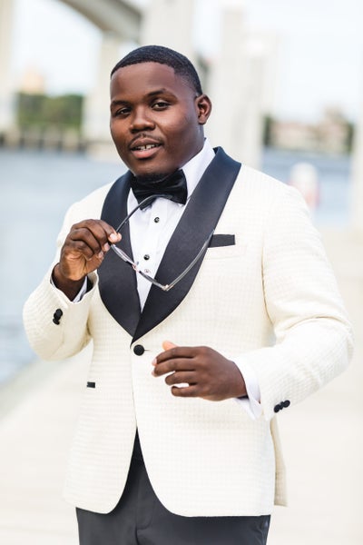 Wendell, dressed in a Leonardo Fifth Avenue tuxedo, is surrounded by his groomsmen for a fierce photo.