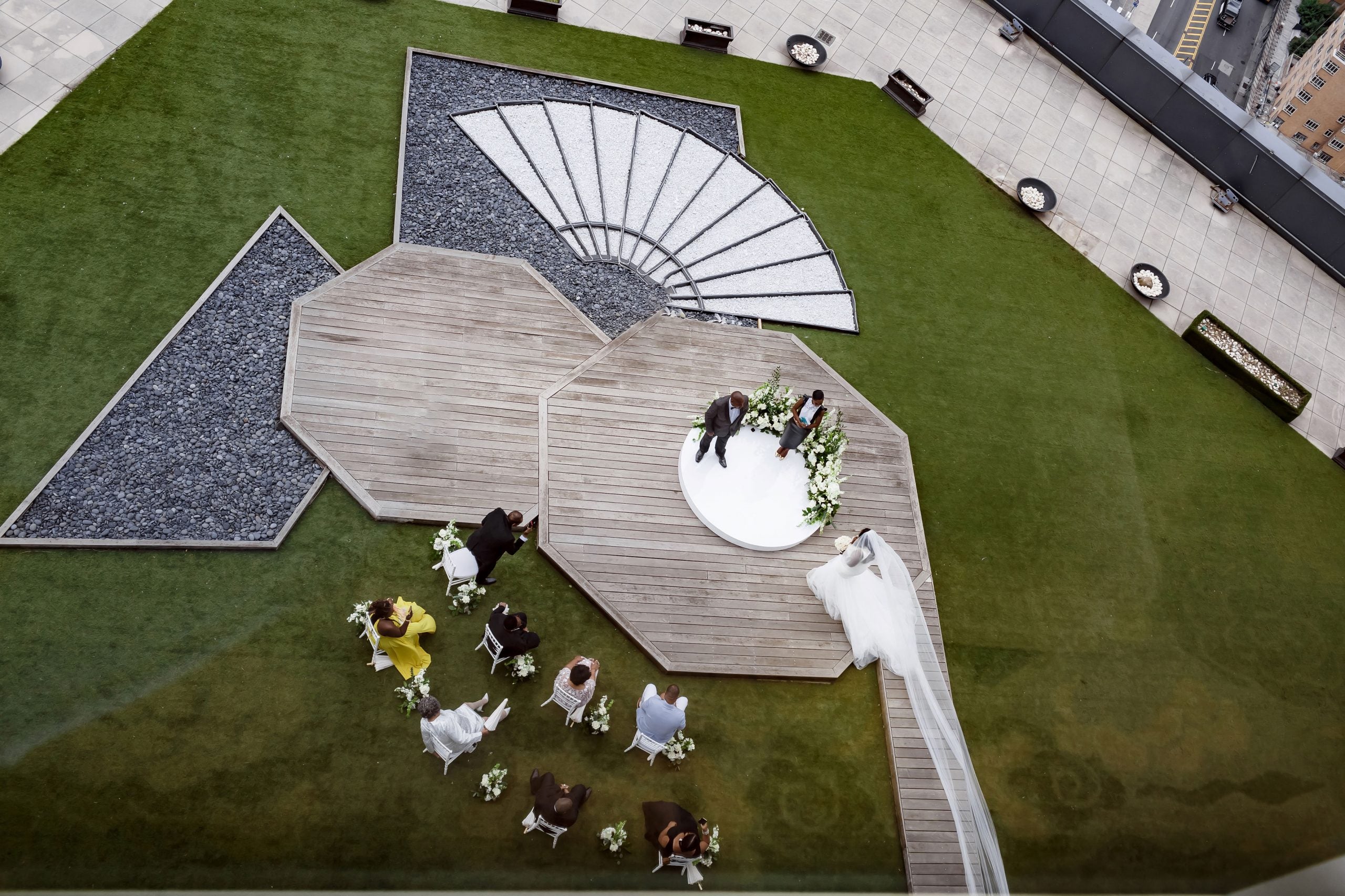 The couple had a beautiful wedding planned at a sprawling Long Island estate called Jericho Terrace in July 2020. Like many other couples, COVID-19 interfered with their grand wedding plans, and their date was postponed to 2021. In the meantime, they decided on a smaller ceremony on the rooftop at the Mandarin Oriental hotel in New York City’s Columbus Circle.