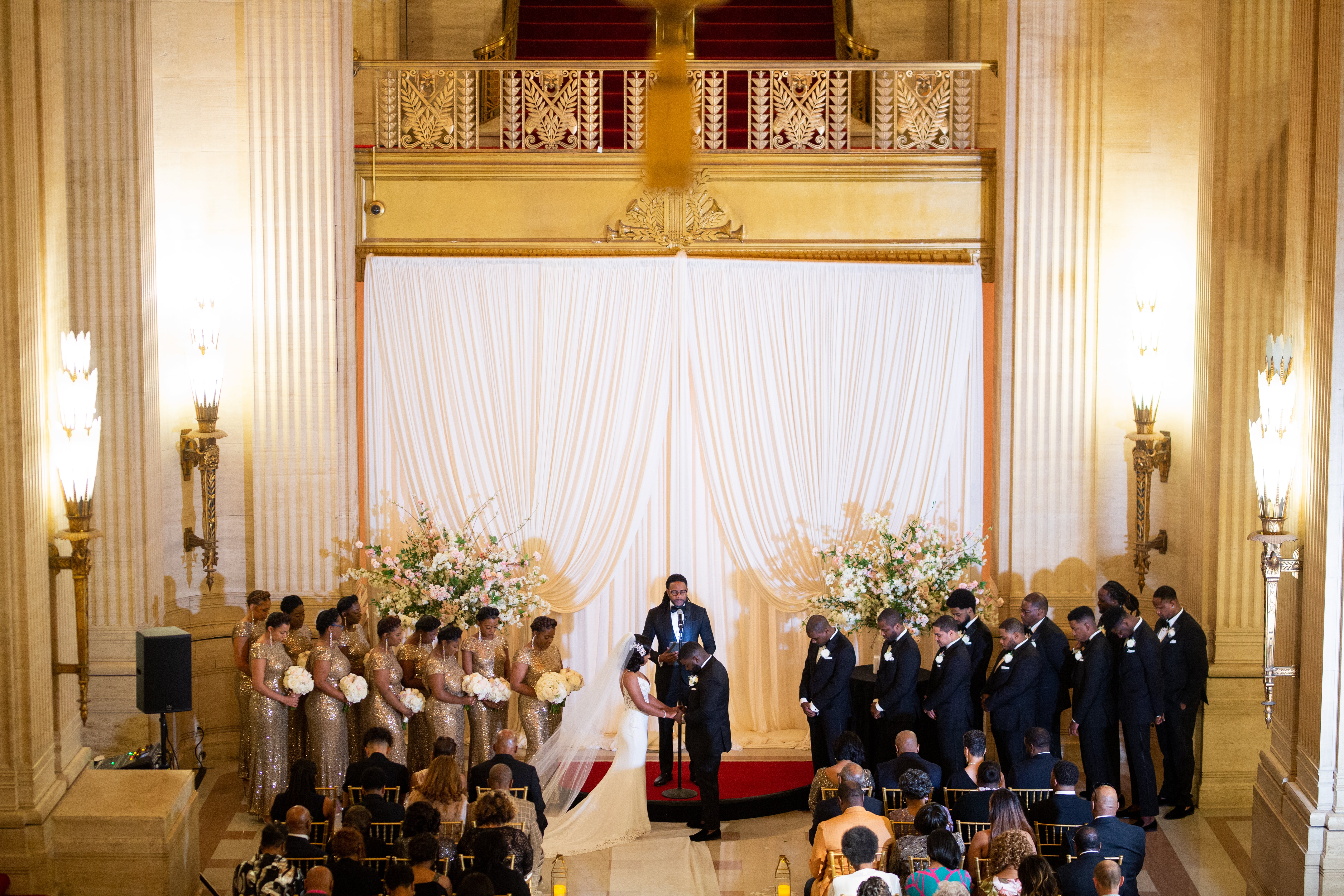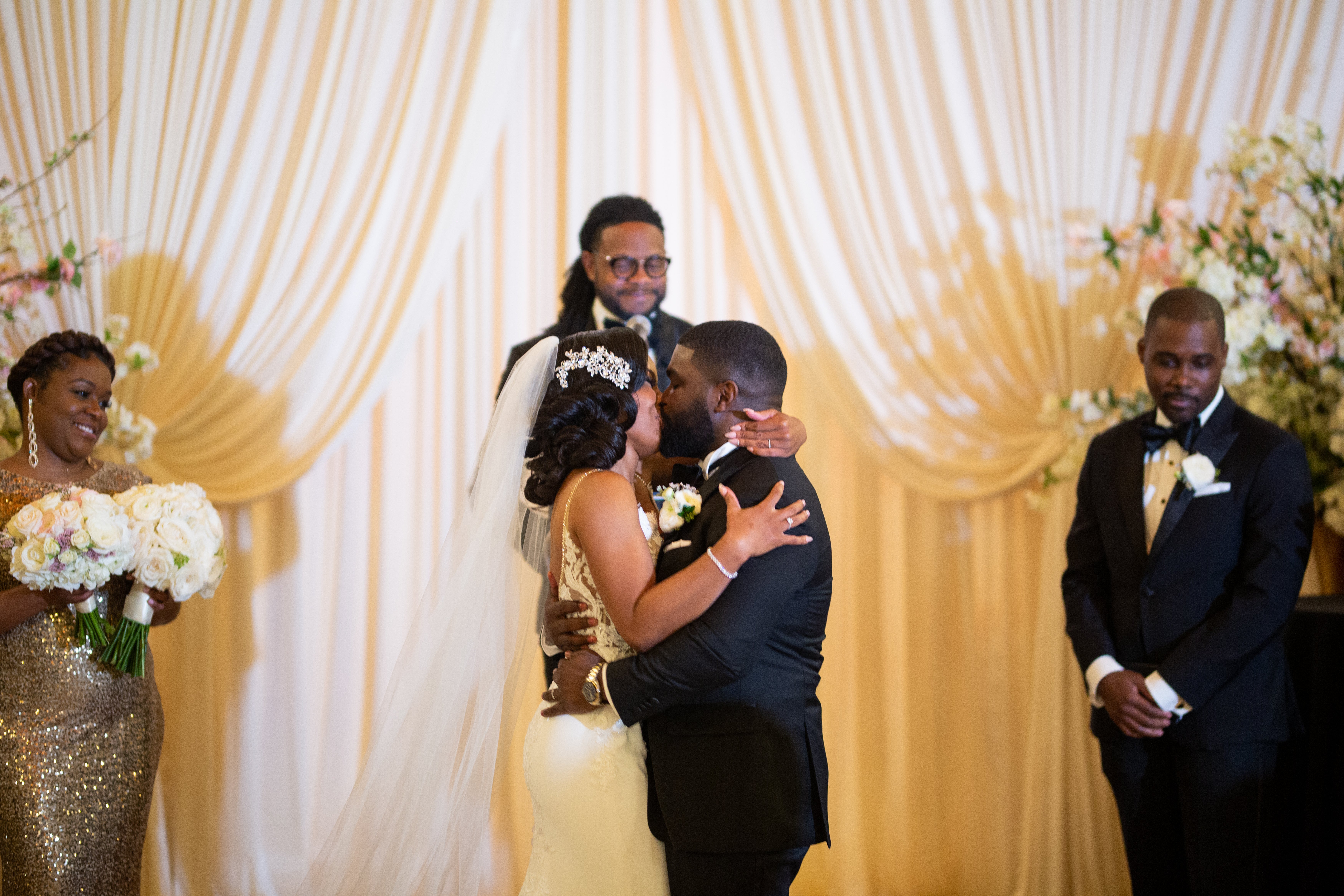 The couple’s color scheme of black and gold carried through to the bridal party’s attire. Thanks to Rent The Runway and The Black Tux, everyone got their exquisite looks for a bargain!