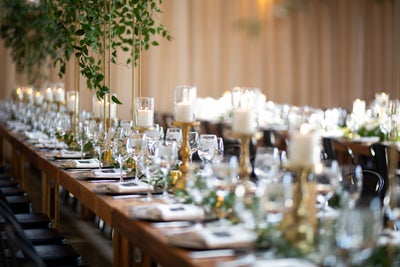 Every part of this wedding had a wow factor, including the table decor. “The element that our guests most enjoyed, were the long family-style tables that encouraged interaction and fun!,” Tiffany says. “When the curtains opened to reveal the room our guests all stood there in awe.”