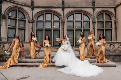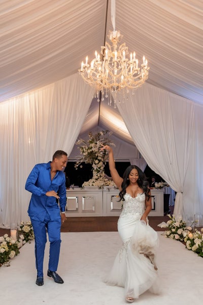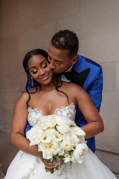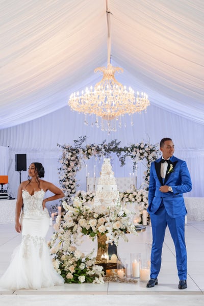Luv, 31, and Barrett, 32, who are also the couple behind the Luv N Slim YouTube channel, were all smiles on their big day, which took place at the spectacular Biltmore Estate in Asheville, North Carolina—a stunning, grand venue fit for a fairytale wedding to be remembered. While strong thunderstorms threatened to shut their wedding day own, after months of careful planning, ultimately the skies opened up and the couple were able to see their dream wedding come alive. “The colors were cobalt blue and gold,” Luv tells ESSENCE. “I had six ladies in my bridal party and Corey had eight groomsmen. ” One hundred guests were on hand to watch the couple become husband and wife.