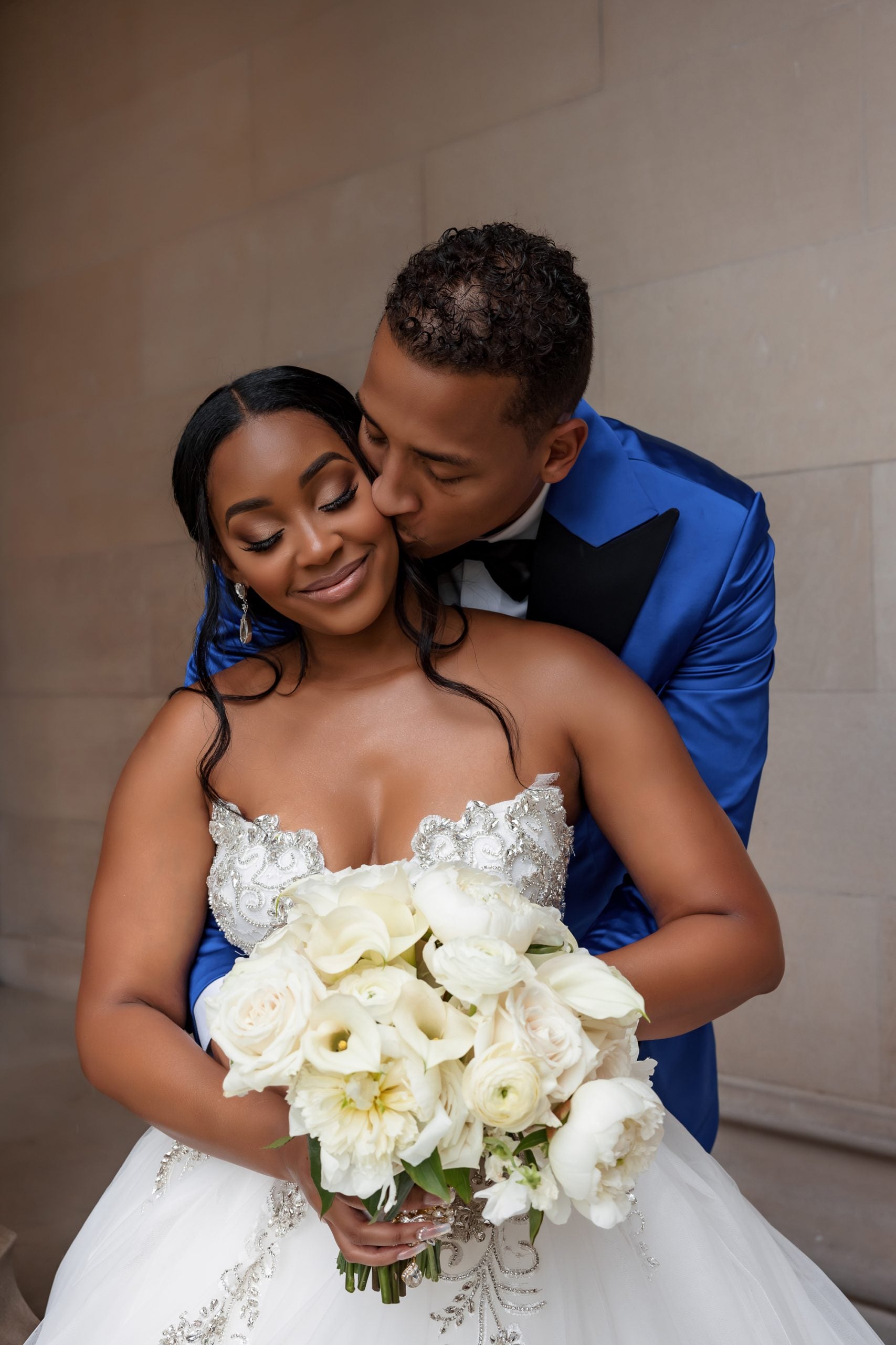 Luv, 31, and Barrett, 32, who are also the couple behind the Luv N Slim YouTube channel, were all smiles on their big day, which took place at the spectacular Biltmore Estate in Asheville, North Carolina—a stunning, grand venue fit for a fairytale wedding to be remembered. While strong thunderstorms threatened to shut their wedding day own, after months of careful planning, ultimately the skies opened up and the couple were able to see their dream wedding come alive. “The colors were cobalt blue and gold,” Luv tells ESSENCE. “I had six ladies in my bridal party and Corey had eight groomsmen. ” One hundred guests were on hand to watch the couple become husband and wife.