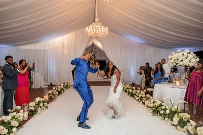 His wife made sure she had all of the fairytale wedding essentials on their must-have list, including a grand castle venue, arriving in a horse drawn carriage and a gorgeous ballgown. “When I put on that gown, I felt like a pure princess.,” she tells ESSENCE. “You know, standing at the altar, in your beautiful Cinderella dress with your prince charming, that truly made me feel special. And of course, standing at the altar with my prince charming too.”