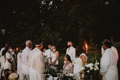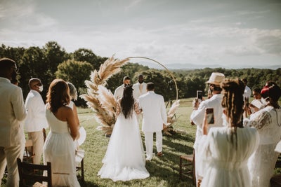 “Everyone wore white to the wedding. For us, that choice not only gave us the look we wanted, but it also symbolized the feelings of togetherness, love, and intimacy that we wanted every aspect of the weekend to embody,” the couple told ESSENCE. “These feelings were important not only because it was our wedding, but they were also important in the context of the COVID-19 pandemic and so much other devastation occurring in the world.”