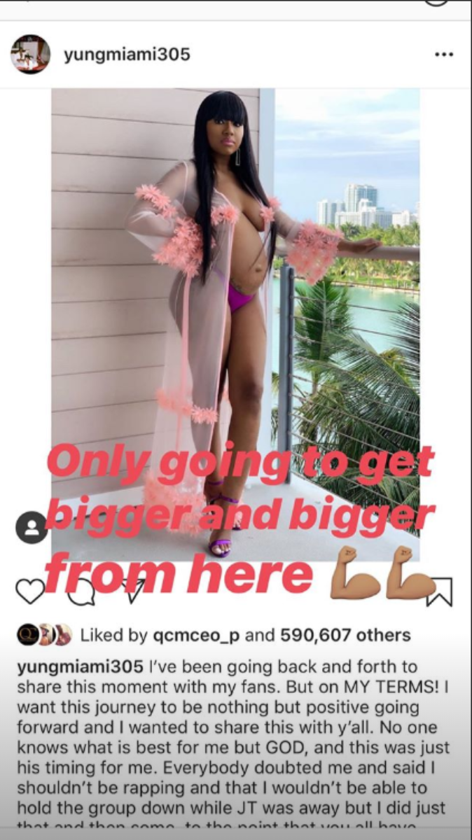 The rapper, who is already the mother to a son, shared a glimpse of her growing baby bump while admitting that the decision to let the world in on her pregnancy was a tough one. “I’ve been going back and forth to share this moment with my fans,” Yung Miami wrote an Instagram photo of herself baring her belly in a sheer robe. “But on MY TERMS! I want this journey to be nothing but positive going forward and I wanted to share this with y’all. No one knows what is best for me but GOD, and this was just his timing for me.”
