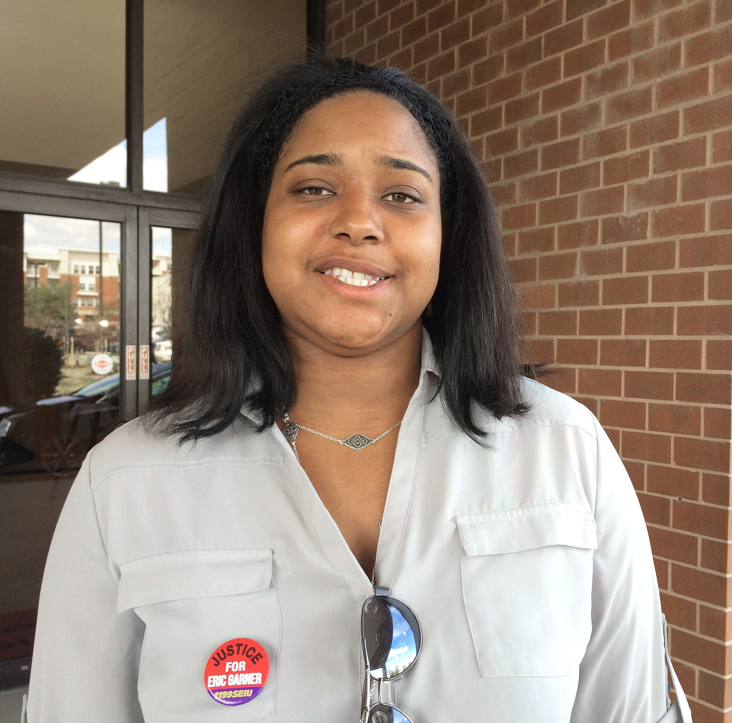 Erica Garner, the daughter of Eric Garner, who was choked to death by a police officer on Staten Island asks to speak with United States President Barack Obama outside the studio during a town hall hosted by ABC News to engage directly with officers, parents, students, community leaders and families on trust and safety in the communities at the Studio Theater July 14, 2016 in Washington, DC.