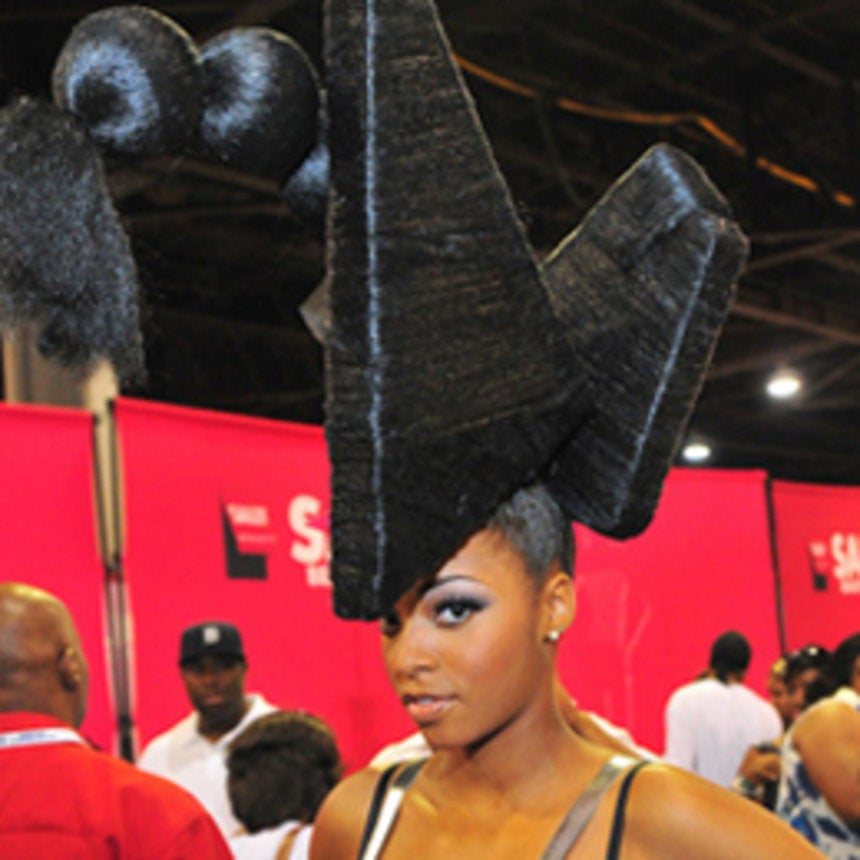 A blue-and-white Oreo bag carved into the side of a head; a purple, four-foot-high “Elvira”-style beehive; and the Guinness World Record holder for the world’s longest dreadlocks. These were just a few of the crazy, hairy — and tad bit scary — jaw-droppers over the weekend at the 2010 Bronner Brothers International Hair Show in Atlanta. The more than 60-year-old trade show, as chronicled in Chris Rock’s “Good Hair” documentary last year, attracts folks from all walks of lock life; literally thousands of stylists, barbers, salon owners, hair models and celebrities from all over the world flock to ATL for the three-day event. In years past, the celeb set has included luminaries like the late Dr. Martin Luther King Jr., Jackie Robinson and Dick Gregory; this year, you were more likely to spot reality TV stars like Derek J. and Dwight Eubanks from “The Real Housewives of Atlanta” milling around. But the biggest draws are, by far, the live-action hair shows: scissor-wielding stylists whipping up the most bizarre and heavenly creations — all to a hip-hop beat. On Sunday, the Oxygen Network hosted the popular “Hair Battle Royale” for a network special that will air this week. In it, competitors attempt outdo one another by cutting weaves into the most unbeweavable fantasy styles. And while most of the shows are strictly for entertainment value, some strike a somewhat serious chord: To combat growing obesity trends in the Black community, UnitedHealthcare sponsored the show’s first-ever exercise-friendly hair competition this year for (don’t laugh) Black women who don’t exercise because they don’t want to sweat out their ‘dos. U.S. Surgeon General (and fellow sista) Regina Benjamin was the guest speaker. And when spectators weren’t jockeying for a space at one of these heated SRO competitions, they were snapping up every hair product known to (wo)man at wholesale prices; huge vats of relaxers, gel, shampoo, and, of course, the most coveted item — the Holy Grail of any Black hair event — silky, booty-skimming tracks of Indian or Brazilian hair. But don’t let the title of the show fool ya: the Georgia World Congress Center — which is the fourth largest convention center in the United States — obviously holds much more than hair products. Visitors also walked away from everything from knockoff designer handbags and sunglasses to vibrators. They indulged in cheap back massages, bought feathery eyelashes, took natural haircare workshops, and got wig consultations all before heading back into the hot Georgia sun.