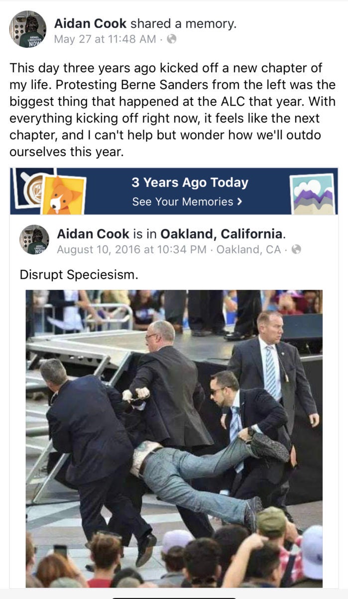 On May 27, Cook, a member of animal rights organization Direct Action Everywhere, shared the memory of secret service agents dragging him away from the May 2016 Sanders’ event—during which he and four other members of DAE jumped a barricade and protested Sanders’ complicity in “factory farming”—adding: