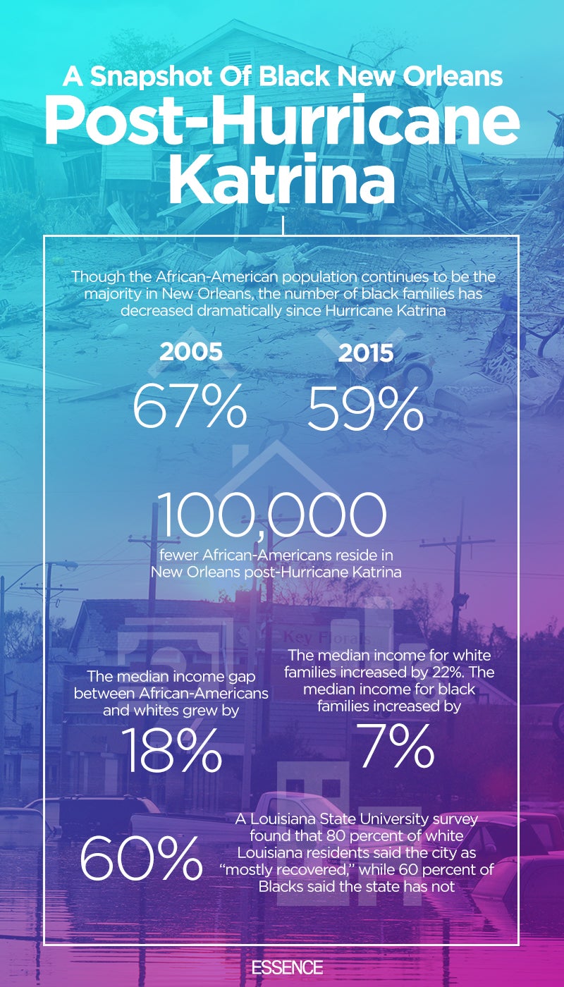 The calamity of Hurricane Katrina, which weighed heavier and more costly for the city’s Black residents due to the placement of their low-lying neighborhoods, has much to do with that. According to the Washington Post, Black residents accounted for 73 percent of those displaced by the storm.