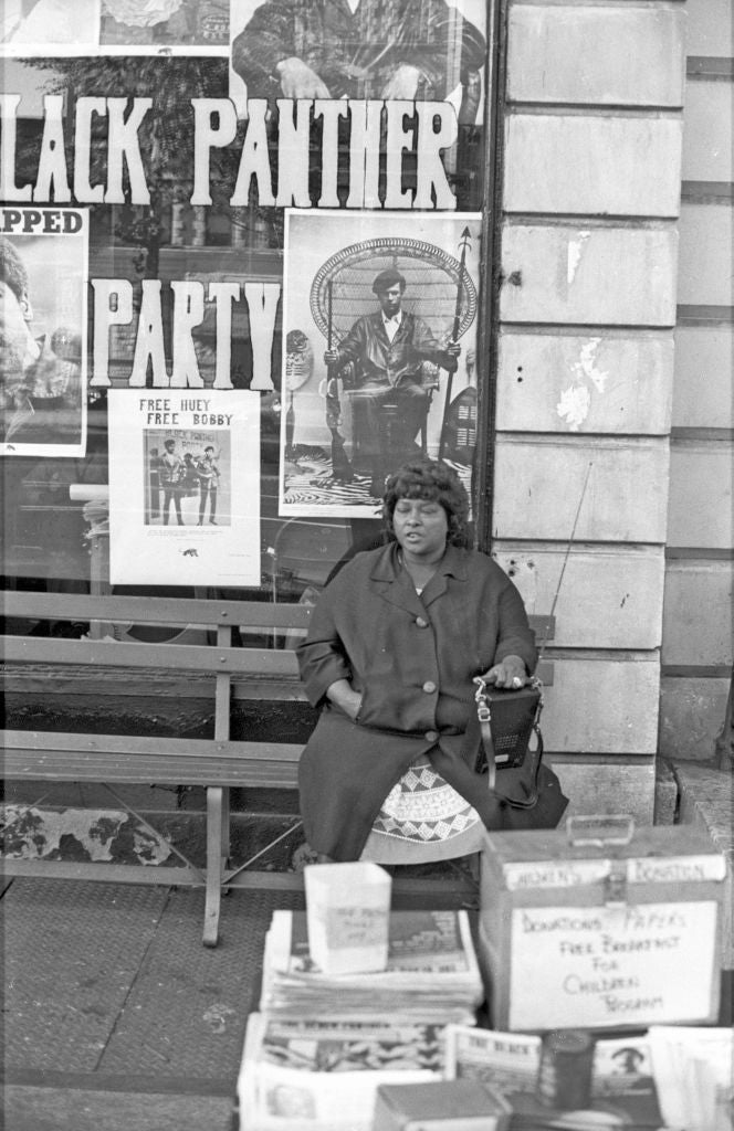 A woman outside Harlem’s Black Panther Party headquarters, joined by an iconic image of co-founder Huey Newton