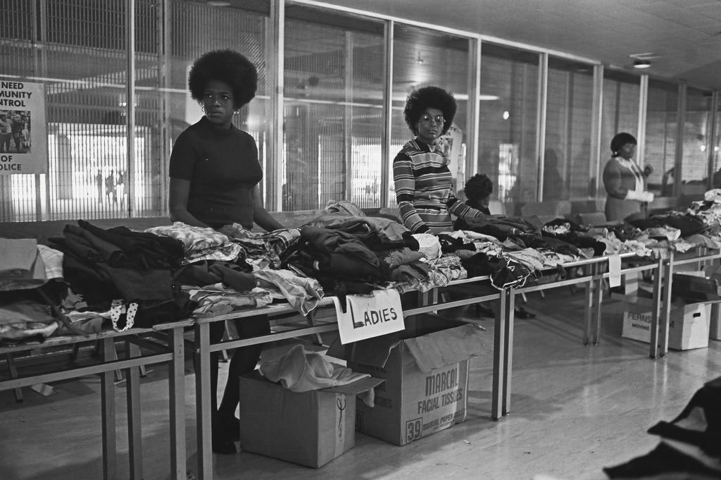 The Black Panther Party was adamant about providing services to their community, like this free clothing drive in New Haven, Conn.