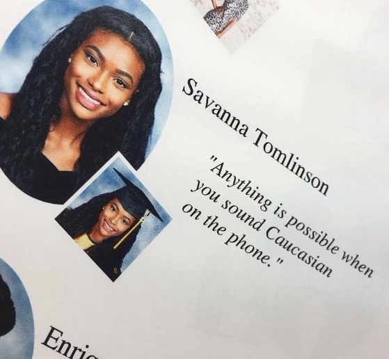For her senior quote in her high school yearbook, graduating senior Savanna Tomlinson made the perfect reference to White privilege with her hilarious addition. “Anything is possible when you sound Caucasian on the phone,” the quote beside her senior picture read.