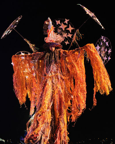 The tradition was brought across the Atlantic from West Africa. The lore of the moko jumbies is that they walked across the Atlantic following the slave ships during the Middle Passage as protectors. The word “moko” is an African word meaning god or Orisha, and “jumbie” is a common word for spirit or ghost used in the Caribbean. Moko Jumbies are highly regarded as protectors whose towering height can help them foresee evil.