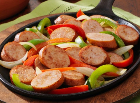 Try this tangy smoked sausage recipe, made with Hillshire Farm Hardwood Chicken Smoked Sausage. Smothered in green and red bell peppers, onions, and ground cumin, Hardwood Chicken Smoked Sausage is a delicious lower-fat option that will spice up any party.