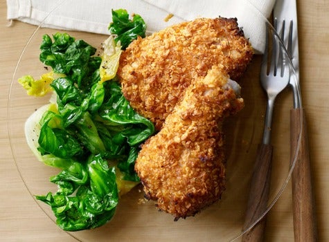 Here comes the part kids like best: Crush the cornflakes by placing them in a big resalable plastic bag, carefully pressing the bag to push out the air. Seal up the bag (with as little air inside as possible) and run over the flakes with a rolling pin. Open the bag and pour the crushed flakes into a wide bowl or onto a plate.