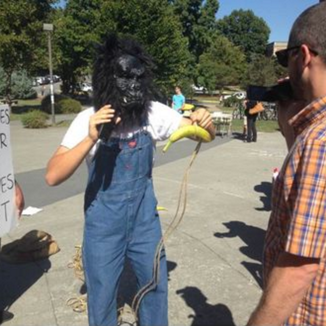 Police reports state that after Rettke’s rights were read, he said he found out about the protest on the social platform Yik Yak. He then said that he went to a store to purchase the bananas, rope, and gorilla mask “in an attempt to provoke the protesters.”