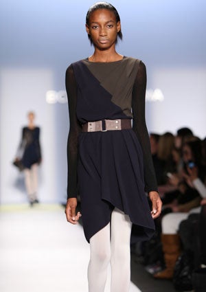 While Marc Jacobs announced he no longer care for celebrities at his fashion shows, over at the BCBG Max Azria show yesterday it was business as usual with PYTs like Keke Palmer and Michelle Williams sitting in the front row surrounded by photographers snapping away. Max Azria, along with his wife Lubov, knows what young, contemporary gals with busy social calendars want to wear. For Fall 2010, BCBG tones down the fantasy and focuses on practical and modern pieces with a collection of lightweight dresses and separates. In a sober but tres chic palette of color block black and grey and later in the show shots of blue, yellow and tan, the Azrias sent numerous interpretations of clean geometric dresses down the runway. These were the kind of sleeveless wrap and tunic silk dresses that can rival your favorite T-shirt when it comes to ease. The beautiful draping, tucks and folds on the billowy dresses were made more accessible with an elastic belt cinched at the waist for a more flattering silhouette. We think this asymmetric hemmed dress here on model Shena Moulton would look great on Keke or Michelle. The other stars of the BCBG show were the platform, ankle strap booties that brought weight to the light clothes. This collection was as much about ease as it was a study in the fine art of layering. Dresses were thrown over a uniform of slim, knit, black and grey long sleeve tops and thick cream tights. Peel off the under layers and you've got season-less pieces for your wardrobe. For a less casual look, the final dresses down the runway were dressed up with touches of sequins and sheer pleats for an effortless, after-dark look.