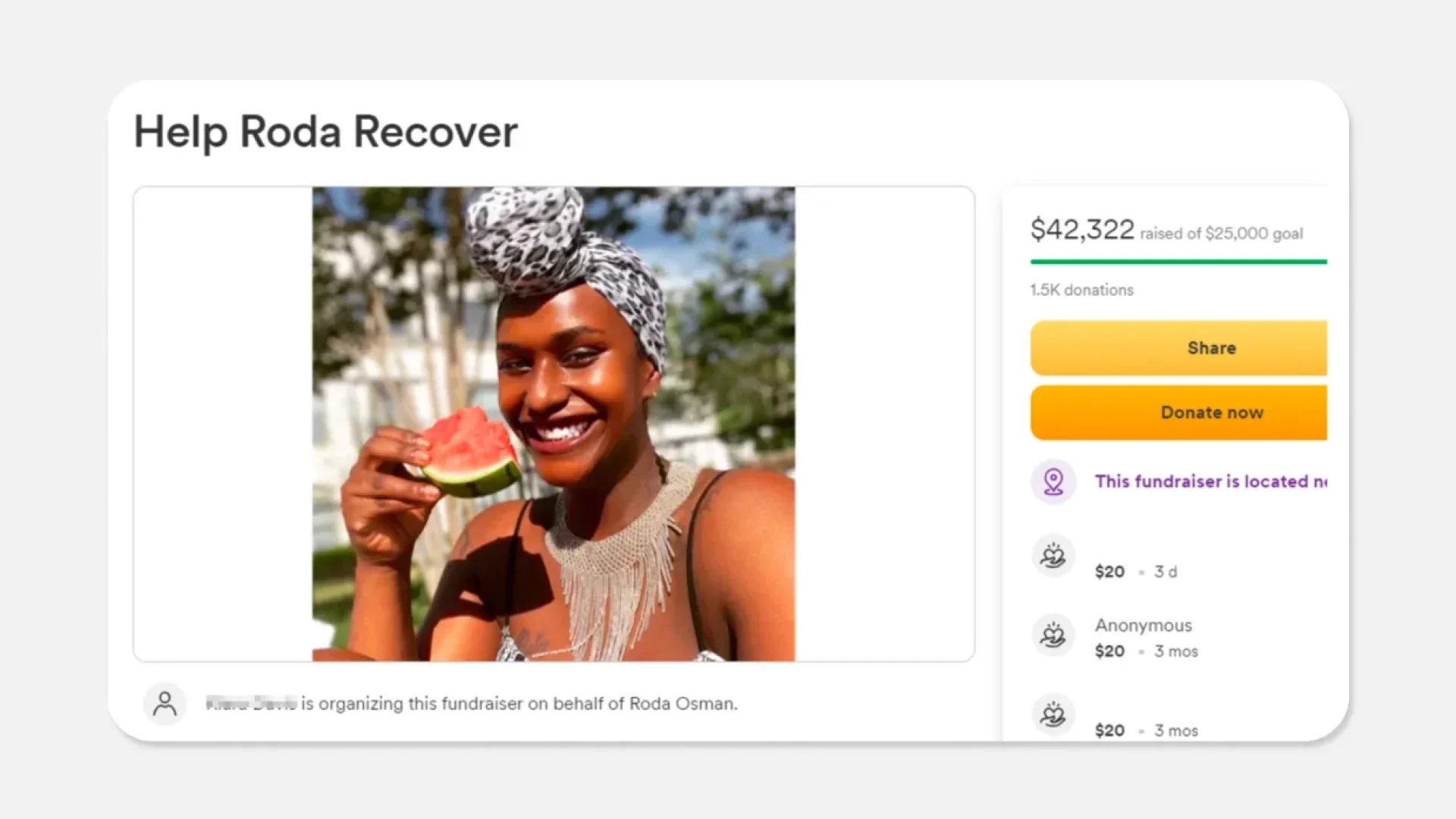 “GoFundMe has zero tolerance for the misuse of our platform and cooperates with law enforcement investigations of those accused of wrongdoing,” said a spokesperson for the fundraising platform. “The fundraiser has been removed from the platform, all donors have been refunded, and Roda Osman has been banned from using the platform for any future fundraisers.”