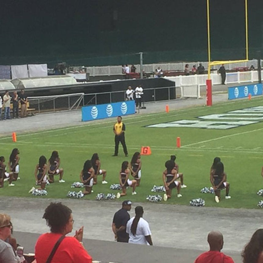 In a powerful photo that soon went viral on social media, the Howard University cheerleaders are seen kneeling during the national anthem — a show of solidarity for Kaepernick and the protest against police brutality.