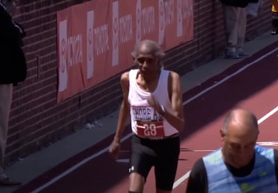 Wright competed against 80-somethings but held his own. He finished the race, clocking an impressive 26 seconds. Competing for Shore Athletic Club, Wright crossed the line seventh of nine competitors, just a couple of strides from fifth place. He received a standing ovation from the crowd of 38,000 at The Franklin Field.