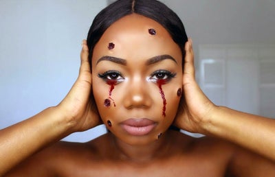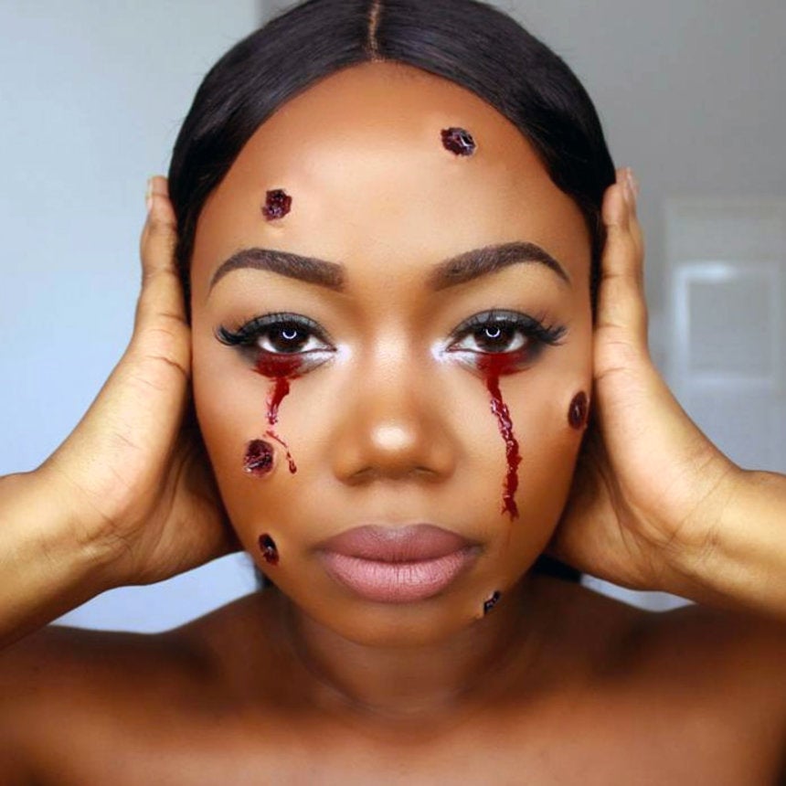 In the midst of protests and rallies, town halls and vigils, makeup artist, Simone J turned to what she knew best, her makeup kit. This weekend, she posted a photo depicting her face with six bullet wounds and tears of blood streaming from her eyes that has since gone viral. Gory though it may be, it is a powerful depiction of Black life in America. We spoke to the makeup artists, Simone J to get her take on the look and she said, “The development of that art piece came about after vigorously following the news of the recent events that took place. I also saw the videos online which were absolutely tragic and heart-breaking to watch. To see that, nowadays, you can actually watch someone take their last breath on Instagram blows my mind. The next morning I woke up to yet another black man (Philando Castile) being gunned down. I don’t think there were words to describe how I felt mentally, emotionally nor physically at that time. Even though I am not a citizen of the USA, I wanted to show my support for the Black Lives Matter movement and to help raise awareness using my platform which is through art, as this situation affects the world. Sometimes when tragedy strikes there are no words to describe what you feel inside.”