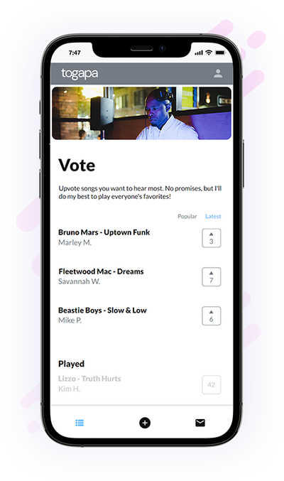 This prompted the idea for his event engagement app Togapa, a play on the words together and apart. It allows in-person, hybrid, or virtual event guests to make and upvote song requests for DJs to see in real-time.