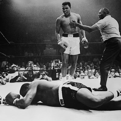 Sonny Liston lies out for the count after being KO’d in the first round of his return title fight by world heavyweight champion Muhammad Ali, in Maine in1965.