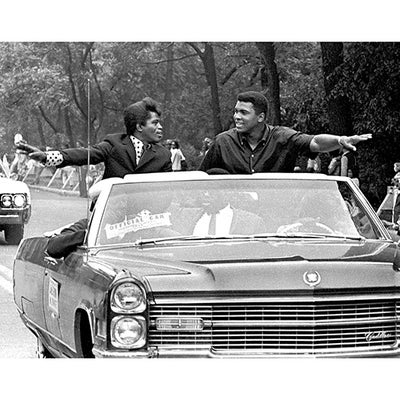 James Brown and Muhammad Ali smile and greet parade goers while participating in the annual Bud Billiken parade in Chicago, Illinois in 1966.