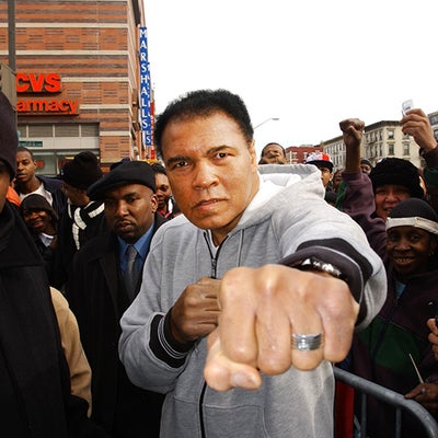 Muhammad Ali entertains a crowd at the Addidas debut of their new global brand advertising campaign where they unveiled a new bill board mural ad for Addidas on 125th Street in the Harlem neighborhood of New York City.