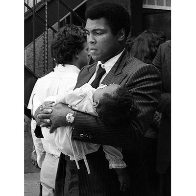 Muhammad Ali with his child in Manhattan, Circa 1970.