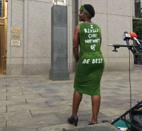 The dress references the inappropriate jacket that the First Lady wore to a detention center for immigrant children in June. The jacket read “I really don’t care, do u?” Okoumou’s dress also referenced Melania’s “Be Best” program to promote children’s well-being and battle cyberbullying. In her first court appearance last month, Okoumou also made a statement with her outfit by wearing a black t-shirt with the words “white supremacy is terrorism” printed on it. “Trump has wrecked this country apart. It is depressing, it is outrageous,” she said outside the courthouse at the time. “I can say a lot of things about this monster, but I will stop at this: His draconian zero-tolerance policy on immigration has to go.” She added: “In a democracy, we do not put children in cages. Period.”Patricia Okoumou (@POkoumou) went to her court hearing trolling Melania Trump with a “Be Best” dress. WHAT AN ICON. pic.twitter.com/chHdCR8v4X