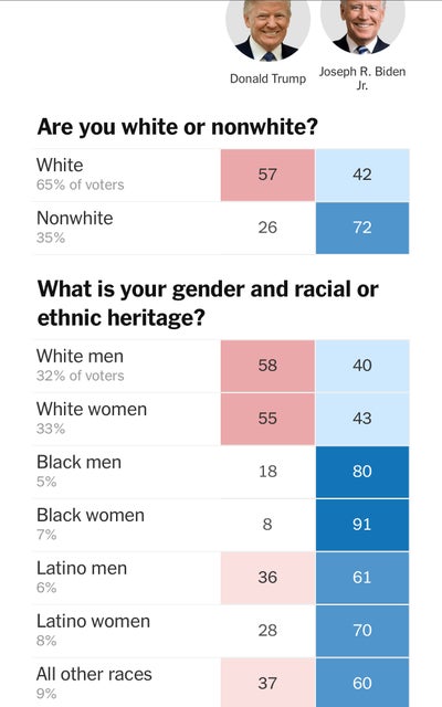 More white women voted for President Donald Trump in 2020 (55%) compared to the 53% (or 52% some polls found) who voted for him in 2016, according to the New York Times exit poll. Additionally, 18 percent of Black men who voted cast their ballots for Trump, compared to 13% in 2016.