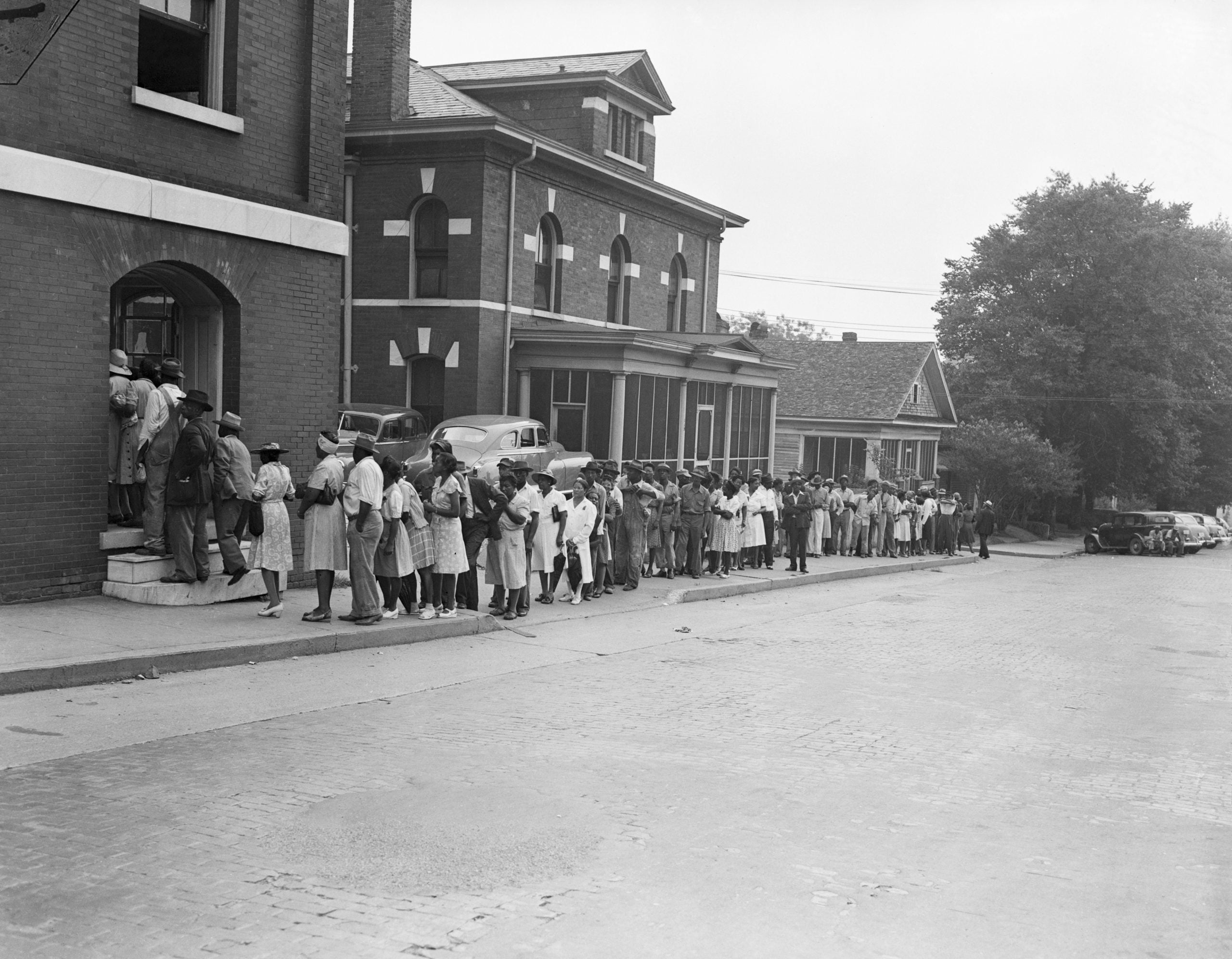 African-American citizens stand in line and vote during an election, Baltimore, Maryland, 1946.