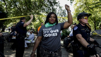 All protesters could be seen adorned in or brandishing a green cloth that reads “Won’t Back Down.” Green has emerged as the abortion movement’s designated color. According to NPR, the shade associated with reproductive rights can be traced back nearly two decades to Argentina, where a growing number of activists were pushing for the government to legalize abortion. The pro-choice hue is said to symbolize hope, health, and life.