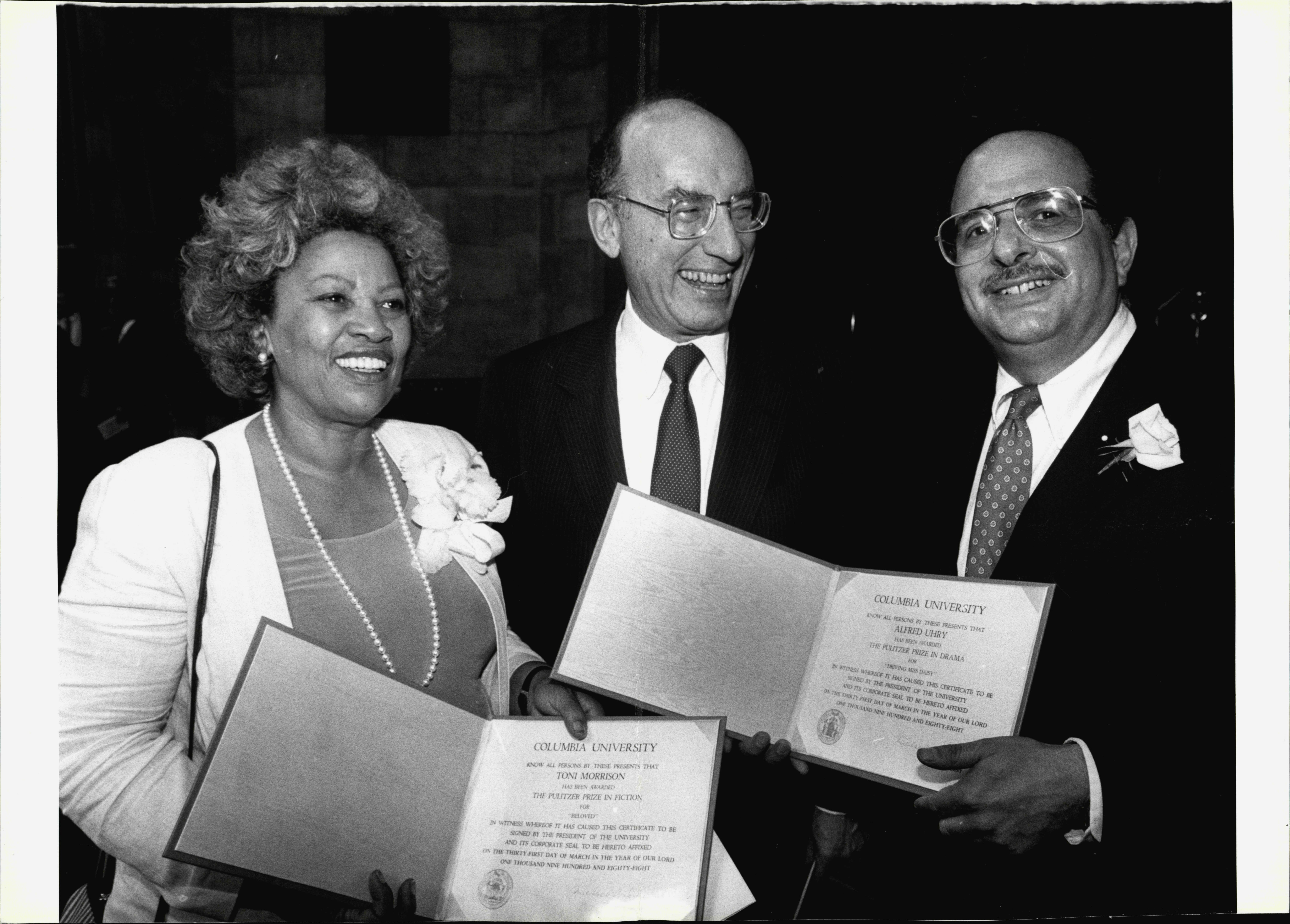 Columbia President Michael Sovern with Pulitzer Prize winners Toni Morrison and Alfred Uhry