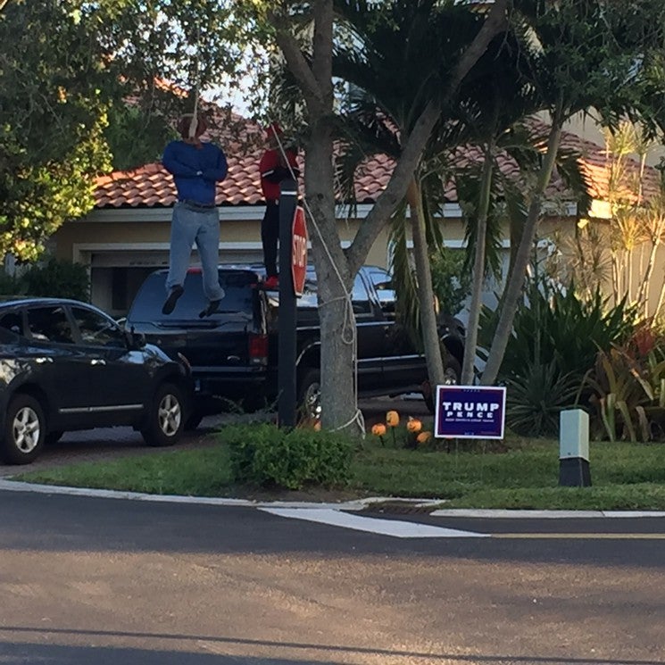 A suburban West Kendall neighborhood was rightfully rattled over the weekend after a local homeowner put up Halloween decorations that included a yard display of two Black dummies dressed in baggy clothing and hanging from a tree. A few feet to the right of the tree was a signature campaign sign supporting Trump and his VP pick Mike Pence.
