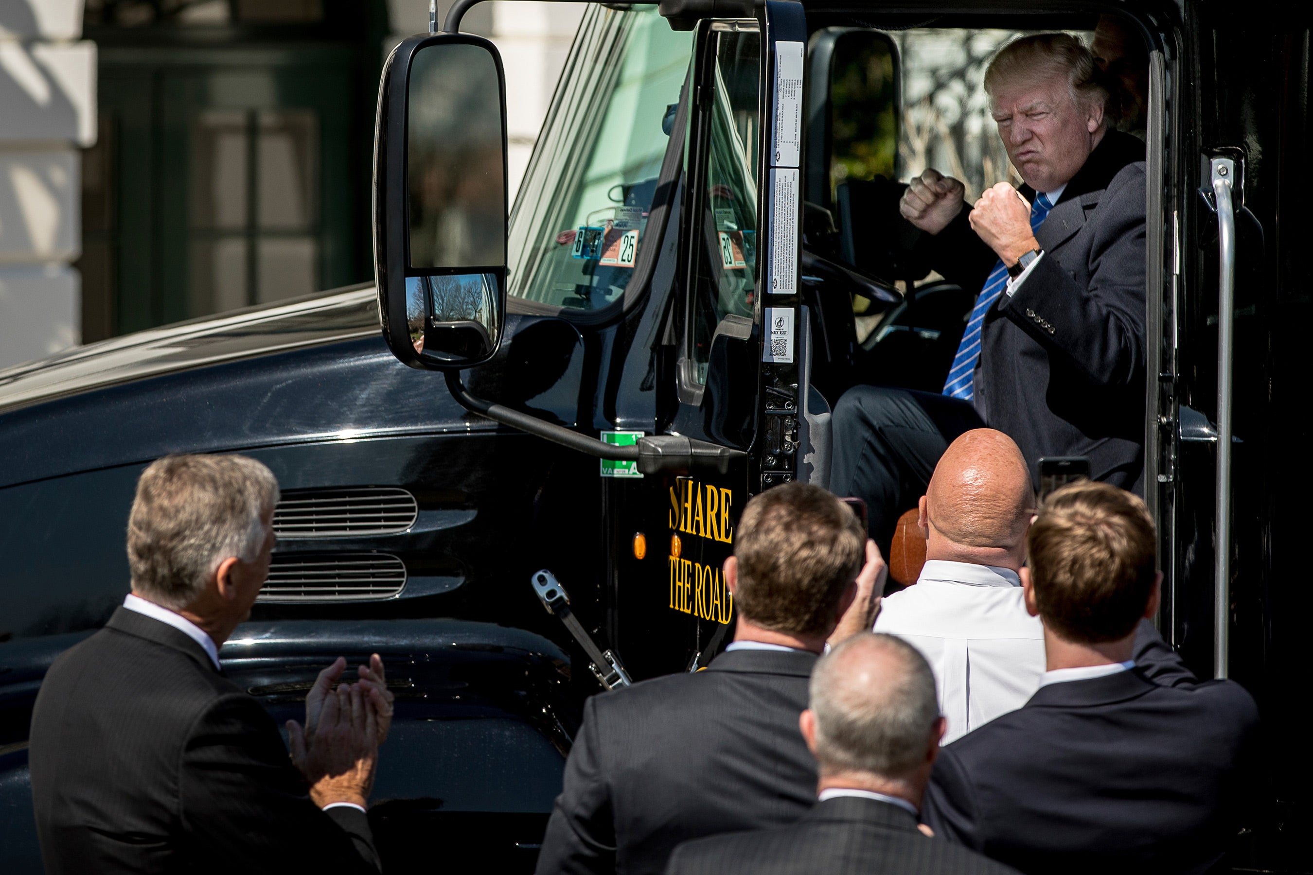 Amid ongoing scrutiny of his health-care plan, Russia ties, wiretapping claims, and proposed budget cuts, President Donald Trump posed in the front seat of a semi-truck parked in the White House driveway on Wednesday.
