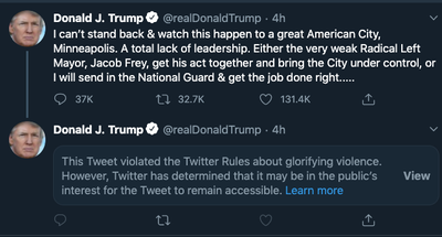 The tweet, more specifically the second one referencing the military and shooting, once again drew the attention of Twitter who has been sparring with the President this week.