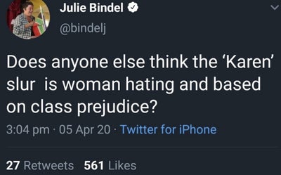 That Lennon/Ono song (remember, you don’t have to be a white woman to subscribe to white feminist pedagogy and ideology) is the most extreme example, but now “Karen is a slur” has logged on to become the latest example of white women not knowing how to read the room and most certainly having so much extra time on their hands in this age of social distancing that they must fabricate a crumb of oppression—which is crucial to maintaining the illusion that is their collective fragility and maintaining the balancing out that is their perpetual victimhood.