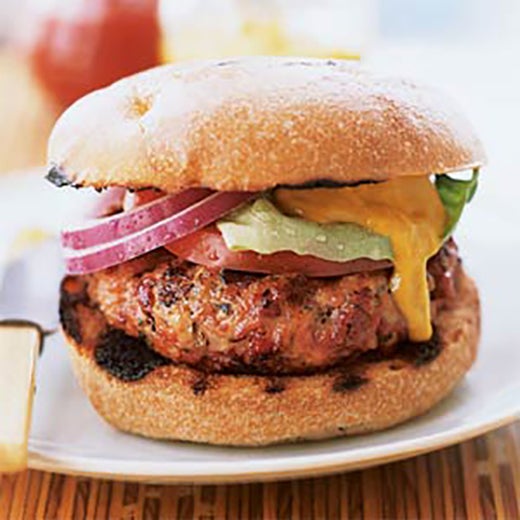 My Recipes’ mixes sharp cheddar cheese and garlic to create this succulent chicken burger.