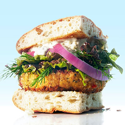 Try My Recipes’ succulent veggie patty surrounded by lettuce, tomatoes and homemade hummus.